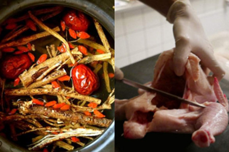 食材:猪脚900克、黄芪20克、川芎3片、熟地半片、桂枝适量、红枣5颗、黑枣3颗、枸杞10克、料酒300毫升、蜜甘草3片、参须15克