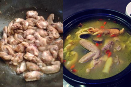 第四步,把炒好的鸡肉放到煮药材的锅中,并倒入适量的料酒,直至将食材全部浸没,用小火慢慢炖50多分钟,然后就可以加入食盐调味了。