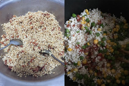 用准备好的老抽和生抽腌制泡发后的糯米,腌制完成后加入虾仁丁,香菇丁,腊肠丁,玉米粒和青豆,进行彻底的搅拌,注意要搅拌均匀。如果食材过多,可以适当的加入酱油后继续搅拌,一直到完全混匀为止。