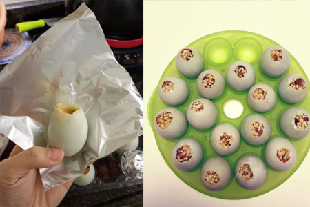 用勺子把制作的糯米馅填到我们做好的鸡蛋壳内,填装完成后用锡纸进行包装,然后放入蒸锅里进行蒸煮,大概一个小时后就可以开锅。开锅后就可以取出品尝美味的黄金糯米蛋了。