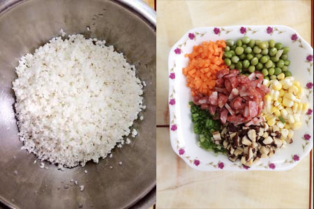 首先我们应该做的是将所有食材进行一个统一的处理,包括将糯米和香菇泡发,应该注意的是糯米和香菇需要浸泡的时间比较长,所以需要我们提前至少一个晚上来浸泡,才能保证能够赶得及制作糯米蛋。其余的食材应该洗干净,虾仁和香菇以及腊肠需要切成丁,而玉米粒和青豆只需要洗干净备用就可以了。