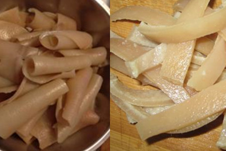 油炸法顾名思义就是把洗干净的猪皮和油一起油炸,不用大火,中火即可,等猪皮呈金黄色就差不多了,关火静置两分钟,把油滤处,然后把猪皮放入冰箱。等需要用猪皮的时候,把猪皮泡两三分钟就可以了,猪皮就会软软的。