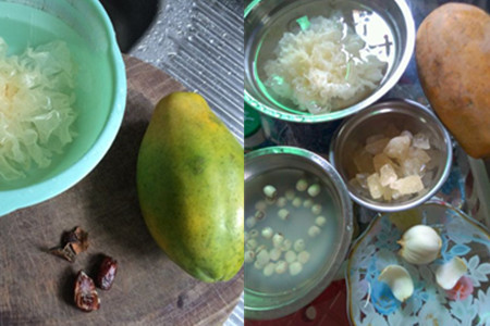 准备好各种食材,包括木瓜、银耳、莲子、冰糖、枸杞等。