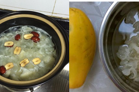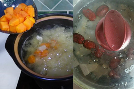 step5、加入冰糖,改为中小火火候,继续熬煮一个小时上下,待锅内的银耳变得滑嫩即可。