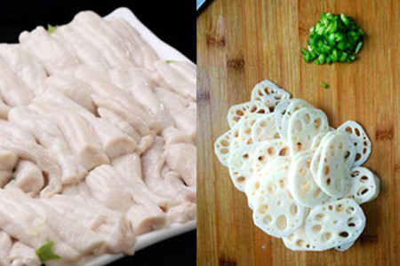 首先,准备好制作菜肴所要用到的各种食材,包括连骨猪脊髓、莲藕、葱段、姜片、料酒、精盐等。