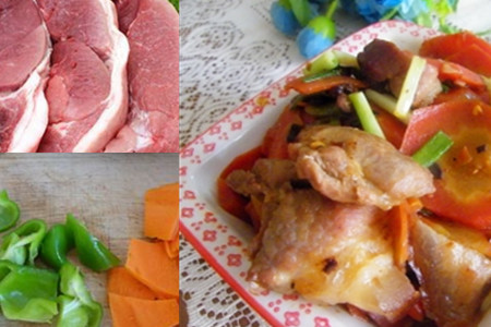 第一:整块的猪肉先用菜刀将它分成薄片状,还需要准备一些胡萝卜和一些青椒,同样也是分成薄片状。