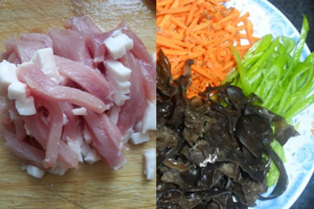 二、猪肉切成条状,尽量切得细一点。用热水把黑木耳泡发,随后切成丝。把胡萝卜和青椒也切成细丝状,生姜和蒜头剁成碎末,葱花切细。