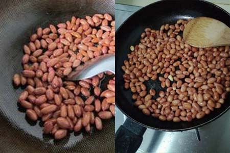 步骤二、将油倒入锅中加热后放入花生进行油炸