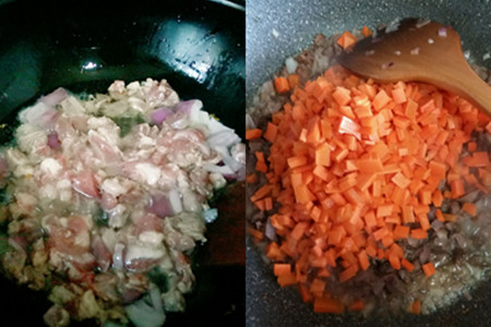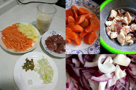 三、加热油锅,先放花椒爆香,然后放入羊肉煸炒,大概三分钟以后倒入胡萝卜丁和洋葱丁。把大米清洗干净放入电饭煲里面,加入适量的清水,接着把前面处理好的材料全部倒入电饭煲里面,再加调味料,就可以开始煮了。
