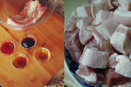 二、把猪肉切成块状,大小和麻将差不多,也可以切成豆腐块大小,不过这样可能会有点难以入味,需要炖煮的时间就比较长了。切好的猪肉块先加入一定的调味料腌制入味。