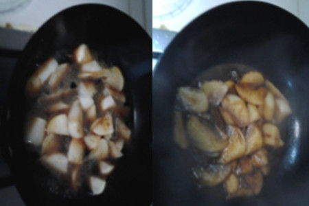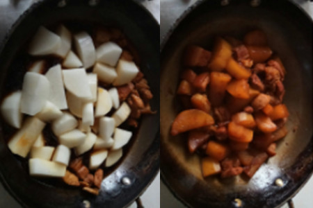 第五步,将火调至小火,慢慢将白萝卜炖熟,收汁,使白萝卜充分吸收汁,快收完汁的时候,用大火收干就可以出锅上菜了。