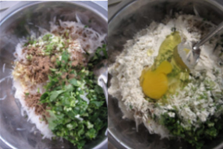 食材:白萝卜600克、鸡蛋一个、小麦面粉250克、香菜50克、姜、葱、孜然粉、花椒粉、油、盐