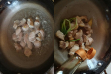 第三步,在干净的锅上倒入适量的油,油煮滚后放入刚才飞过水的五花肉,将其炒到有油出来,变成焦黄色之后放入葱段和姜片,接着倒入料酒,加入适量的老抽和酱油,翻炒。