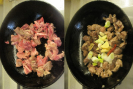 第四步,把牛肉炒出油以后,将葱花和姜片还有蒜头放入锅中,接着再把花椒、八角以及小红辣椒放进去,继续翻炒。