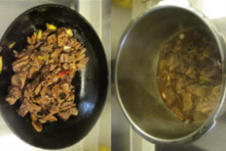第六步,把炒好的牛肉倒入压力锅中,并加入适量的水,水量刚好没过食材,再往压力锅中加入香叶,盖上压力锅的锅盖,煮到压力锅的压力阀有响声之后,继续焖10分钟让其收汁,就可以关火了。