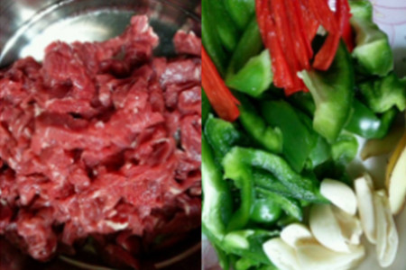 食材:牛肉400克、青椒两个、辣椒一个、姜适量、蒜头适量、油适量、盐适量、味精适量、生粉适量