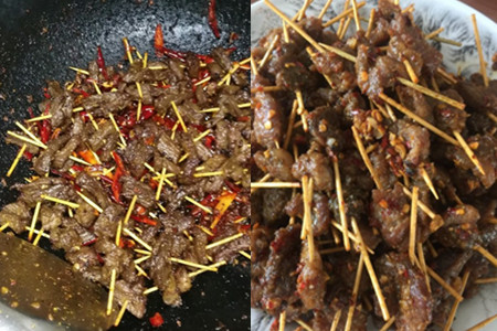 五、起热油锅,然后加热到一定程度的时候,就把处理好的牛肉串放入锅中,煎炸几分钟就可以出锅了。等到沥干了油水,就能够摆盘,然后一盆香喷喷、热辣辣的美食就诞生了。