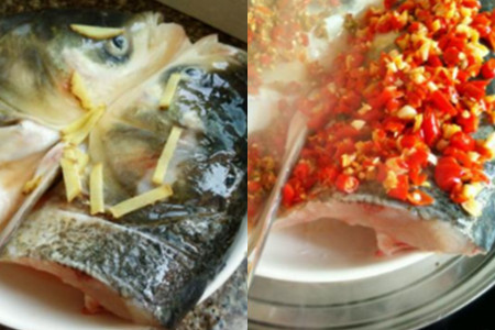 第五步,在鱼头上撒上姜丝、切好的小米椒、葱段、蒜瓣,再倒入适量的蒸鱼豉油。