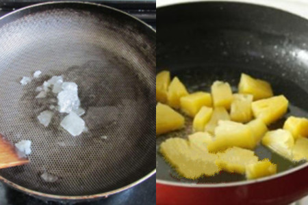 第三步,把适量的糖放到干净的锅中煮化,然后把切好的菠萝放进去,用锅铲翻炒使菠萝充分吸收糖分,然后盛出。