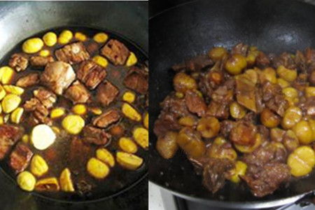 食材:排骨500克、板栗250克、蒜头适量、盐适量、酱油适量、红烧汁适量