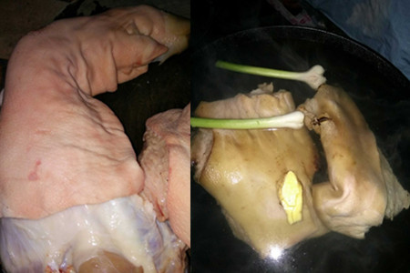 1、把猪脚的毛拔干净,特别是猪掌那里。在锅里烧好沸水,把姜放进锅里,煮出味后,把猪脚放进去,把猪脚焯水,这是为了去去猪脚的腥味。