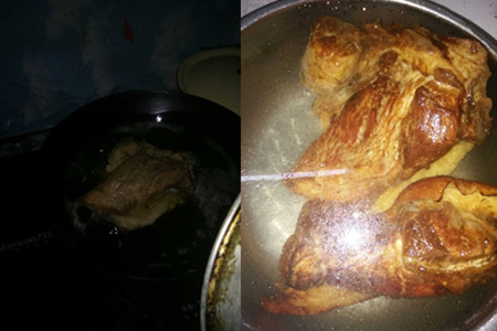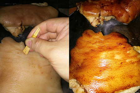 2、煮几分钟后拿着牙签试试猪脚有没有软,软的话拿出来沥干水。重新起锅,蒸下猪脚,把猪脚的香味都蒸出来。