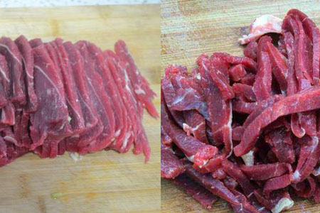 首先将买回来的牛肉进行清洗,浸泡在水中一段时间后用厨房纸把牛肉上的水分吸干,之后再晾一段时间,等待水分全部晾干,就可以将牛肉切条了,牛肉切条的大小可以根据个人的喜好来定,喜欢大口吃肉的朋友可以把牛肉尺寸切大块点。一般将牛肉切成手指大小的形状就可以。