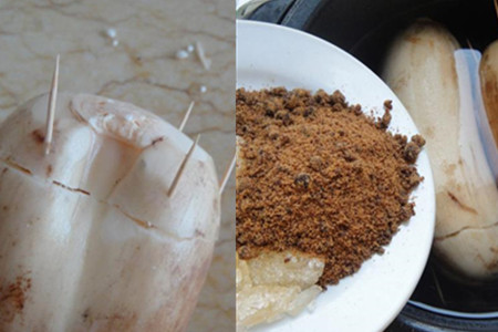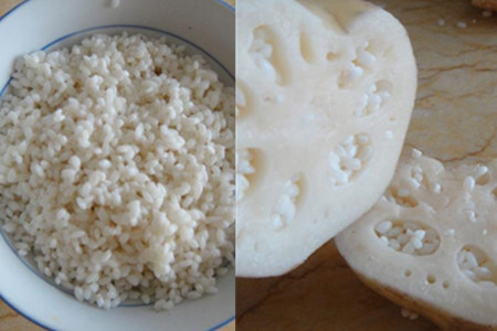 1.糯米漂洗干净,放入清水中泡着,泡到涨开后捞起滤干。莲藕清洗干净,把莲藕的一端切开,往莲藕孔里灌糯米,直到每个孔都灌满。