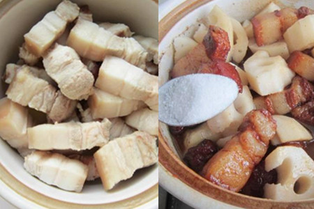 3.30分钟后,将藕块加入锅中,继续炖20分钟。待锅中汤汁煮至半干时,淋入少许香油,撒入少许鸡精,炒匀即可盛出锅。