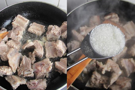 2.炒锅热油,将蒜片下锅爆香,再把焯过水的排骨加入锅中,炒匀。翻炒片刻后,淋入适量料酒炒香,再加入适量白糖继续炒,然后兑入适量清水,加盖,大火烧开后转为小火炖煮30分钟。