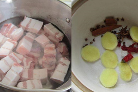 1.五花肉切小块,凉水下锅,大火煮开,去掉五花肉的血沫,捞起滤干。姜洗净切片,干辣椒泡发切段,香葱洗净切末。
