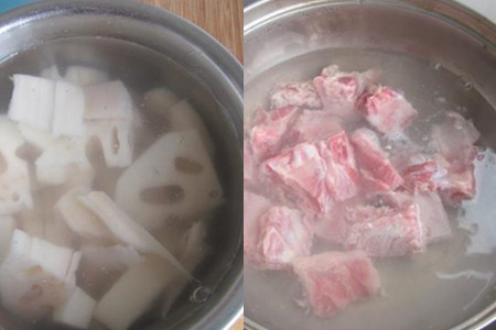 1.莲藕削去外皮,用清水泡着待用。排骨洗净斩成小件,凉水下锅焯一下,捞出用清水冲凉待用。
