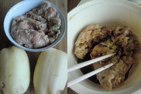 1.莲藕清洗干净,削去外皮待用。肉馅装入碗中,调入适量胡椒粉、白糖、料酒、香油、鸡精、酱油,搅匀,制成馅料待用。