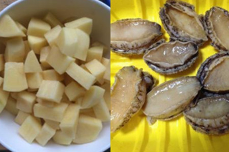 食材:鲍鱼若干个、土豆500克、葱适量、姜适量、蒜头适量、料酒适量、花椒粉适量、鸡精适量。