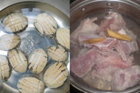 第一步,把鲍鱼擦洗干净后,用小刀撬出来,并划上几刀;把排骨斩成一块块;把姜切片;把葱切成葱花;把蒜头剁碎。