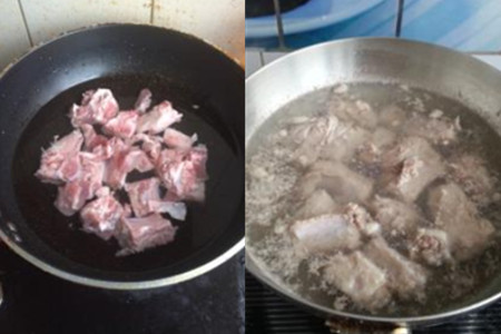 第二步,在干净的锅中加入半锅水,加热以后,把斩好的排骨放入锅中,盖上锅盖,水再次煮滚后揭开锅盖,并把焯好水的排骨捞出来,盛放在碟子上,放置一旁待用。