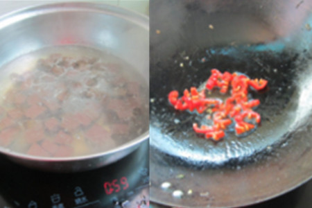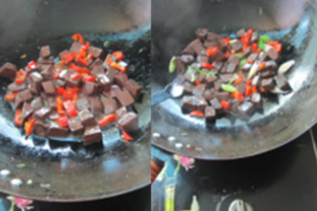 第三步,在锅中煮油,然后把红辣椒放进去,爆炒爆香,接着把刚才飞水过的猪血放进去一起翻炒,放点盐后继续翻炒。