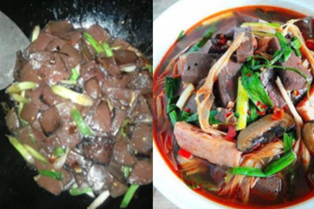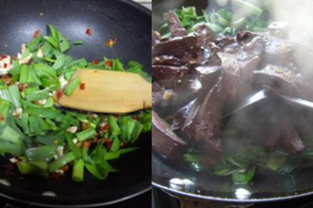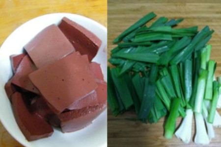 食材:猪血300克、蒜苗适量、青尖椒适量、葱适量、油适量、盐适量。