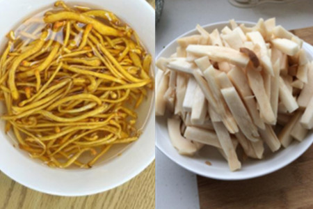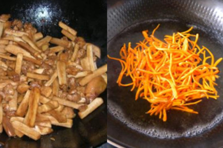 第五步,把虫草花放入无水无油的锅中干煸,煸熟后再加入适量的油,再炒几下后,把剩余的芡汁倒入进去,翻炒均匀后盛出。