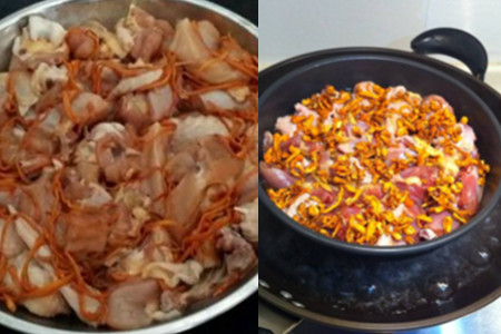 第一步,先把虫草花去蒂洗干净,然后用清水浸泡一个钟;把鸡肉斩开,斩成一件件。
