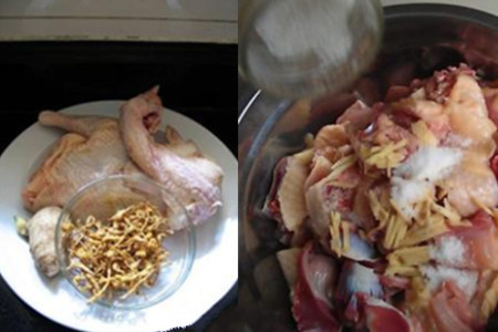 食材:虫草花30克、鸡肉200克、姜片5克、料酒3毫升、白糖2克、老抽2克、鸡精1克、淀粉适量、胡椒粉适量、油适量、盐适量。