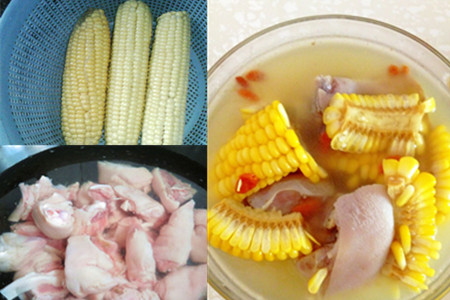 第一步:你需要先准备好哦食材:玉米、新鲜猪脚。当然你需要先将它们清洗干净,然后用刀剁成块状,建议大家还准备好一些生姜片,这样对于去除腥味有帮助。