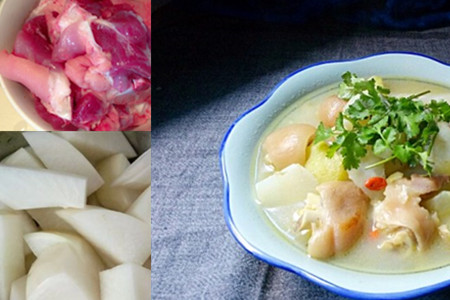 第二:先将切好的猪脚放进开水中煮,等到水煮沸腾的时候,将上面的泡沫捞干净,加入姜片开始用中小火炖煮。等到1个小时之后,加入白萝卜一起煮。