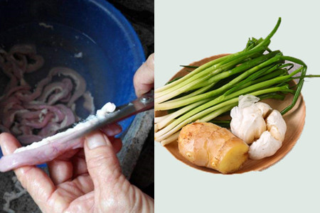 小肠清洗起来比较麻烦,因为内里的粘液会比较难去除。所以我们清洗的时候可以先用筷子把小肠翻出来,在上面撒上一把面粉,用手使劲搓洗就能把粘液清洗干净。然后用刀子刮去肠壁上的油脂,切成半指长的段备用。
