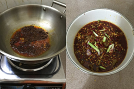第五步,在牛肉高汤上加入适量的辣椒粉、适量的花椒粉以及适量的芝麻,搅拌均匀后,把煮滚的油浇在上面即可。