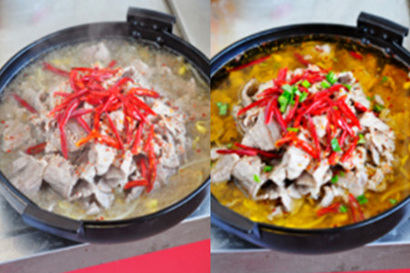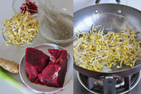食材:牛里脊肉、豆芽、干辣椒、姜、葱、八角、花椒粉、胡椒粉、辣椒粉、芝麻、蚝油、淀粉、蛋清、粉条、盐、高汤。