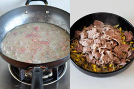 第四步,把固体高汤放入干净的锅中,并倒入适量的水,将其煮开,煮开以后把粉丝放进去烫,粉丝烫熟后把牛肉片倒入高汤中,焯两下,看到牛肉的颜色变白之后,把刚才盛出来的食材再倒回牛肉高汤中。