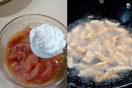 第四步,把大量的油倒入锅中,煮热后把沾有淀粉的里脊肉放入油锅中炸,把炸好的肉块捞出沥干油份。