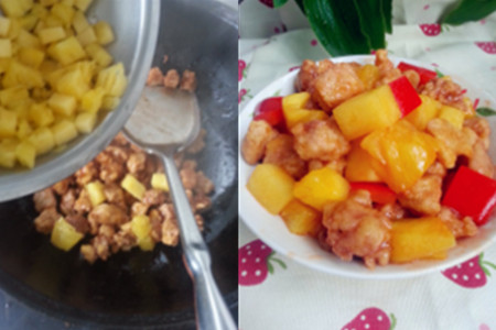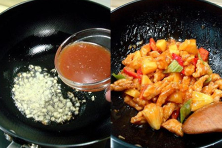 第五步,把淀粉加入适量的水,变成芡汁后,倒入酱汁中煮,接着把菠萝块和炸好的肉块放入翻炒,让其充分吸收酱汁。