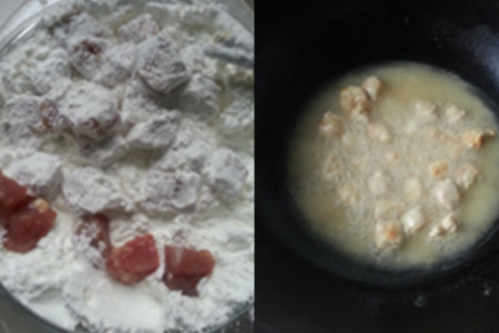 第二步,把鸡蛋打入腌制的肉块中,打散,并加入适量的淀粉,用筷子将每一块沾有粉的肉块夹起来甩掉多余的粉,放入热油锅中炸,炸好后夹上来。